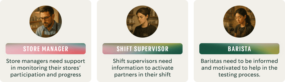 Store Testing team members, Store Manager Peer Coaches (SMPCs), Store Managers, Assistant Store Manager, Shift Supervisor, Barista, Survey Experts